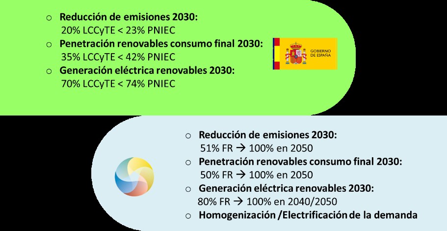 El objetivo de reducción del nivel emisiones de GEI del 23% para 2030 respecto a 1990, planteado en la última versión del PNIEC, siendo ya insuficiente e incoherente a largo plazo con el objetivo de alcanzar la neutralidad climática en 2050, se ve reducido a un 20%. De manera similar, los objetivos planteados en el PNIEC del 42% de penetración de energías renovables respecto al consumo de energía final desciende incomprensiblemente a un 35% y el 74% de generación eléctrica con renovables al 70%.