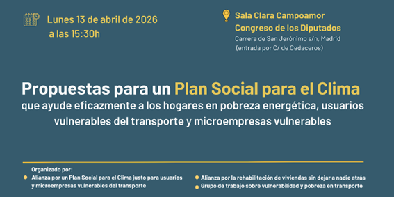 Como miembros de la Alianza por la Rehabilitación de Viviendas Sin dejar a nadie atrás, organizamos la jornada «Propuestas para un Plan Social para el Clima que ayude eficazmente a los hogares en pobreza energética, usuarios vulnerables del transporte y microempresas vulnerables», el próximo lunes 13 de abril de 2026, a las 15:30h, en la Sala Clara Campoamor del Congreso de los Diputados, Carrera de San Jerónimo s/n (entrada por C/ de Cedaceros), Madrid.
